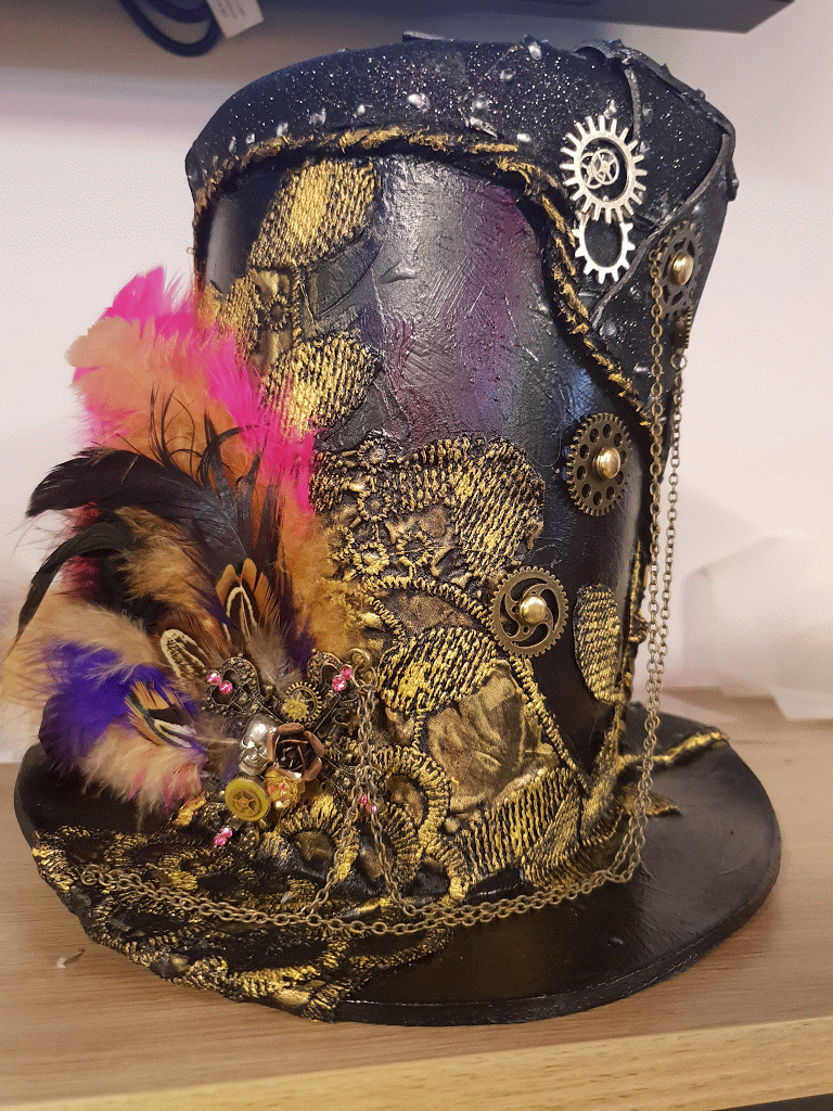 The girls had to construct their top hat using black cardboard, and then using glitter or plain foam, attached square shapes in a patchwork pattern and embellished their hat with cogs, wire, lace and chain.