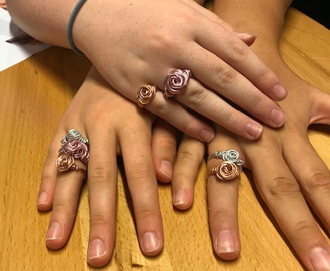 This is the first week back for the Cre8 Lab, and the students are really keen to learn about wire wrapping. During the week long workshops, the students will learn 4 different types of wrapped rings, increasing in difficulty as they go. Our first “Rose” ring was a big hit and most of the girls completed at least two rings. During the workshops not only do the students learn wrapping techniques, they learn design techniques and collaborative learning. They are encouraged to work together and try new things as they learn. Each day will be a new ring, so I will keep you posted with the different designs.
