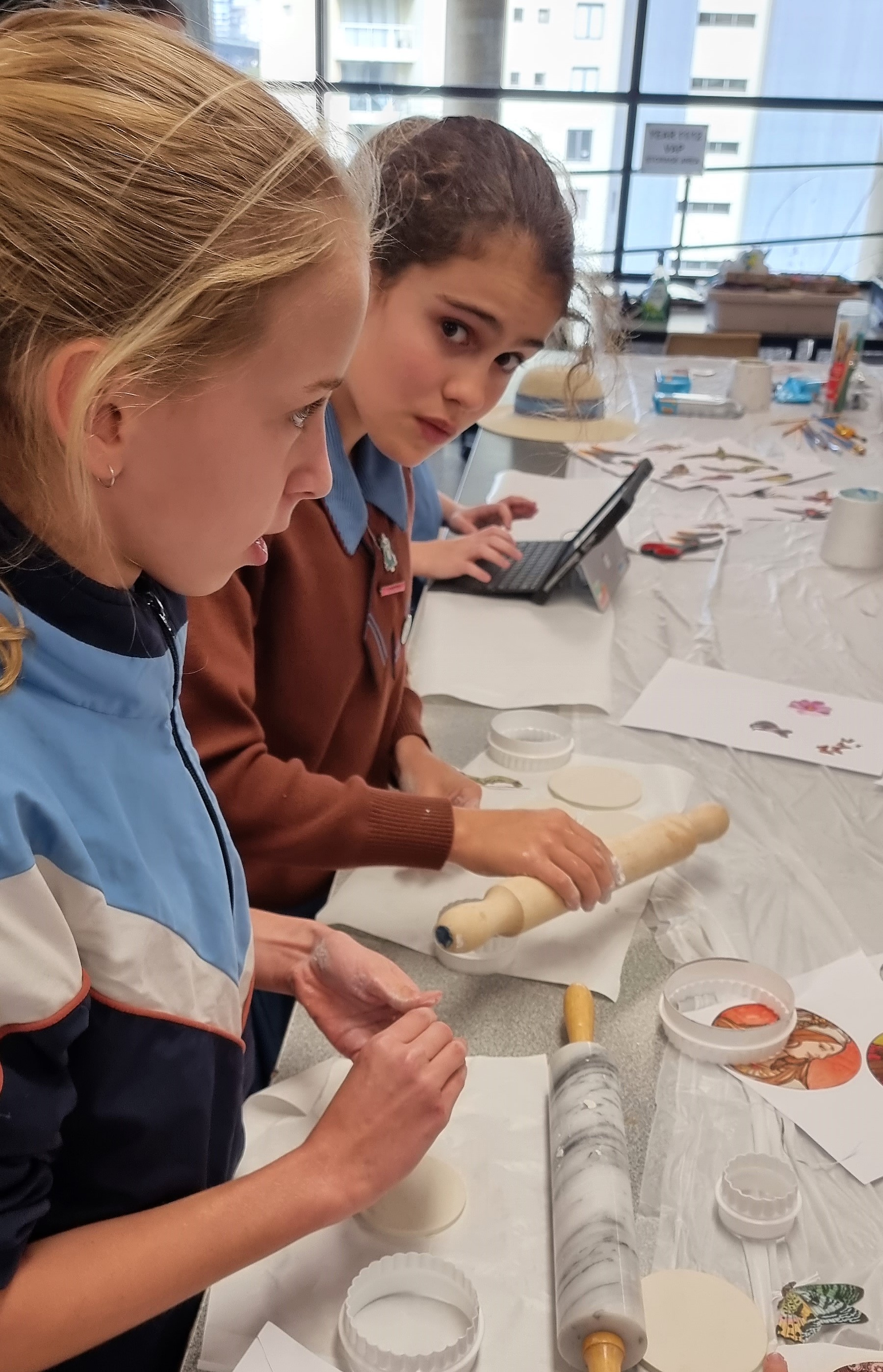 After warming up the clay, the students rolled out the clay onto a flat surface and cut three to four circles using a cookie cutter. They then cut the image to suit the size of the clay and moistened the top of the circle until it was slightly sticky. Each image was then slightly wet both sides so it would adhere to the clay. Then it was a case of patting the image very lightly so it became part of the clay. Then give them time to dry…