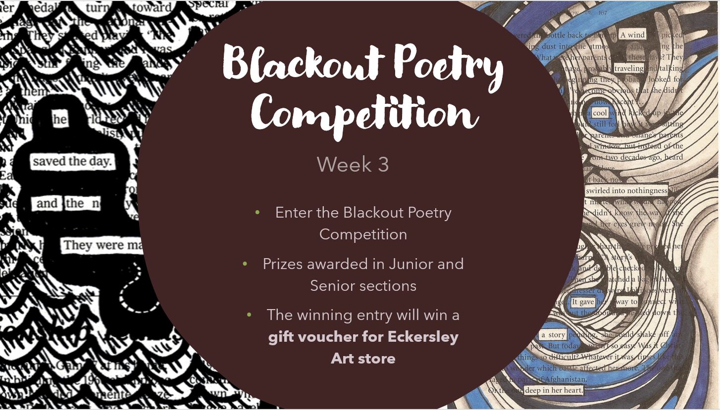 Blackout Poetry is a form of “found poetry” where you select words that inspire you from a page in a book. Then you “redact” all the words you don’t want. This is often done with a black marker, hence the name “blackout poetry”. Your chosen words will form a new message, giving the text a whole new meaning.